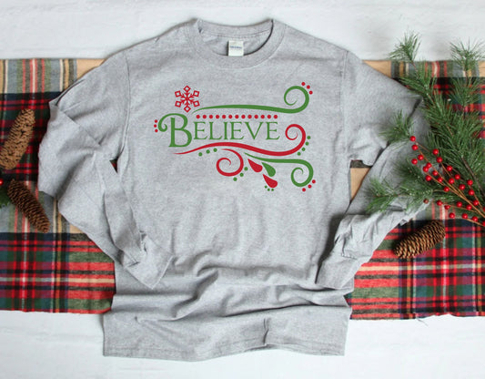 Believe Long Sleeve Shirt, Christmas Shirts, Holiday Shirts, Winter Shirts, Inspirational Shirts, Family Christmas Shirts