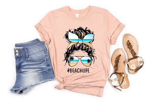 Beach Life Shirt, Messy Bun Headband Sunglasses Shirt, Summer Shirt, Beach Shirt, Girl's Trip Shirt, Messy Bun Shirt, Women's Shirt