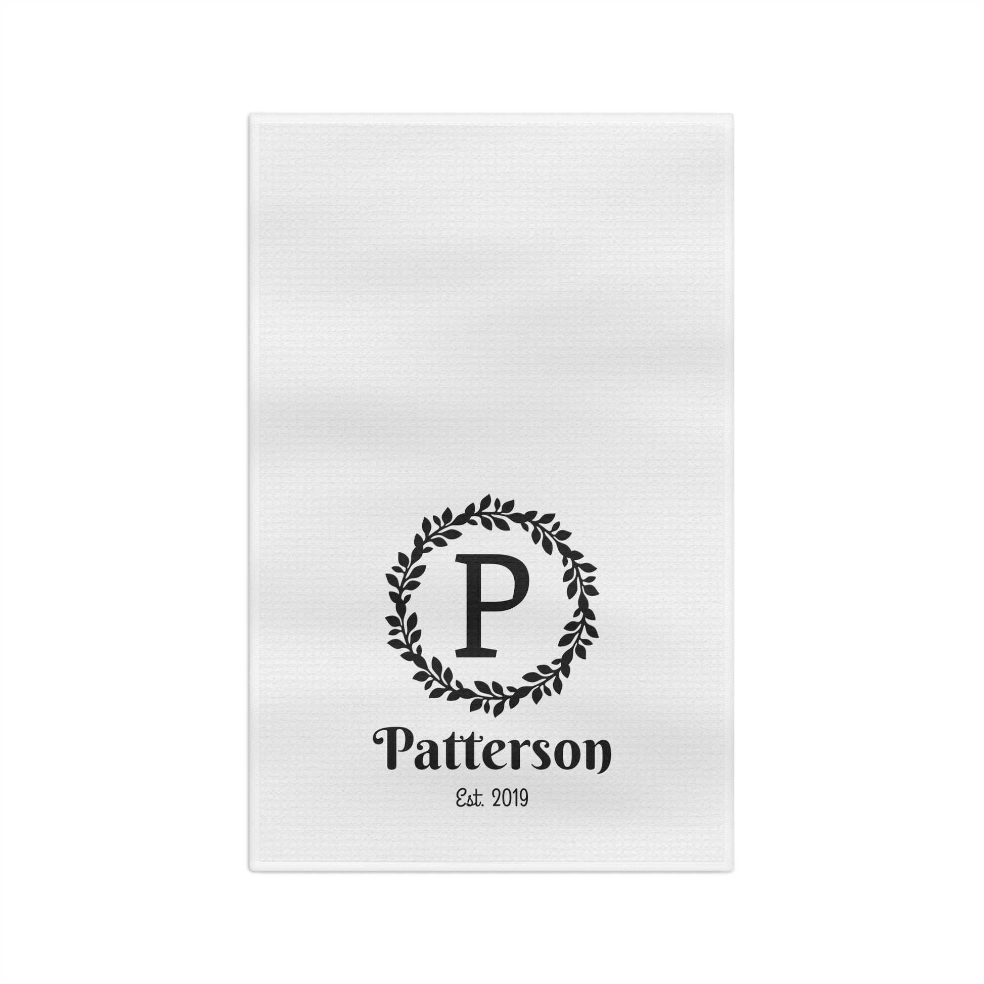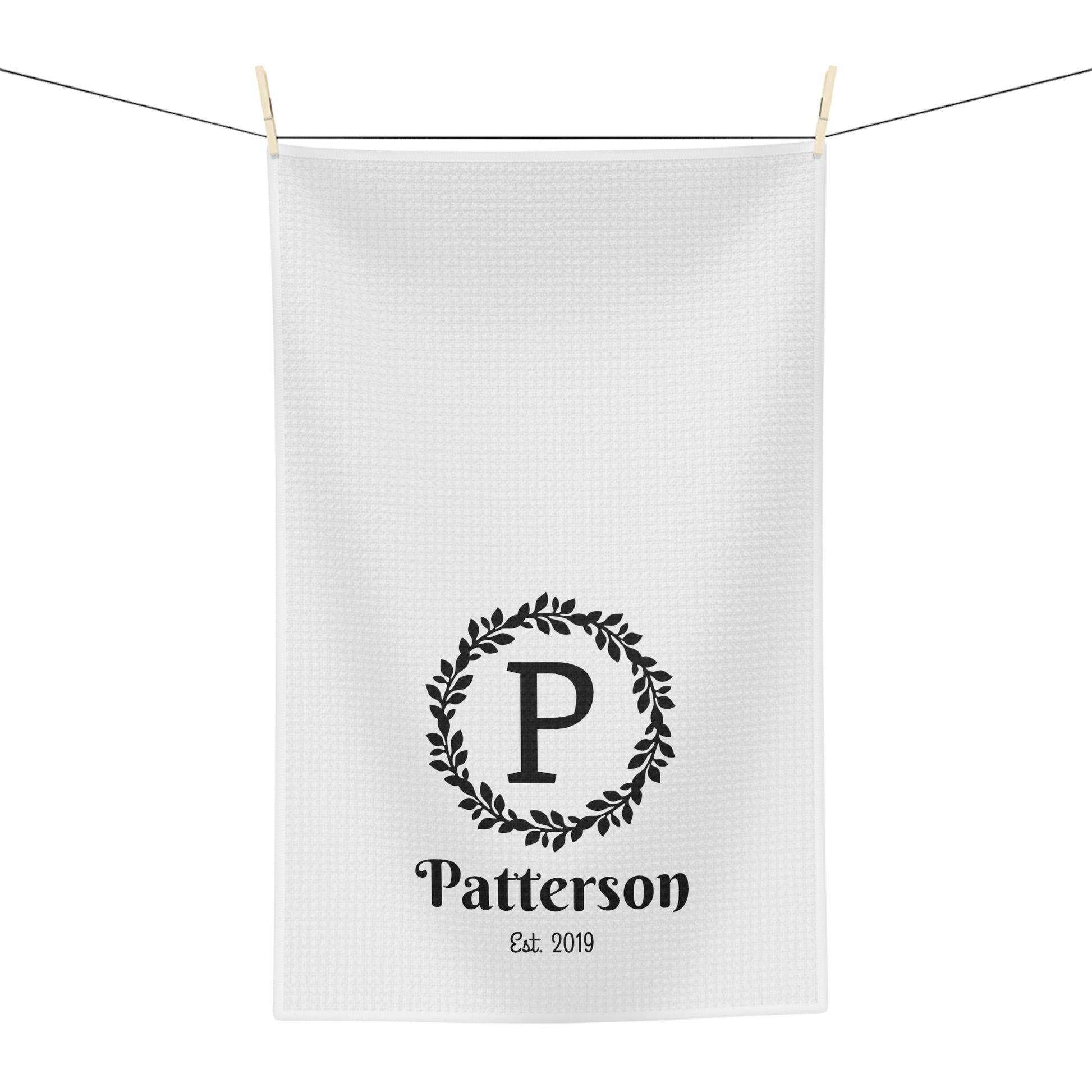 This design features your family name and the year it was established. You can choose the color you prefer, and it will be printed on a soft, white waffle weave towel that measures 16" x 24". This towel design is popular for weddings, housewarmings, hosting, and Christmas gifts, especially for new couples.